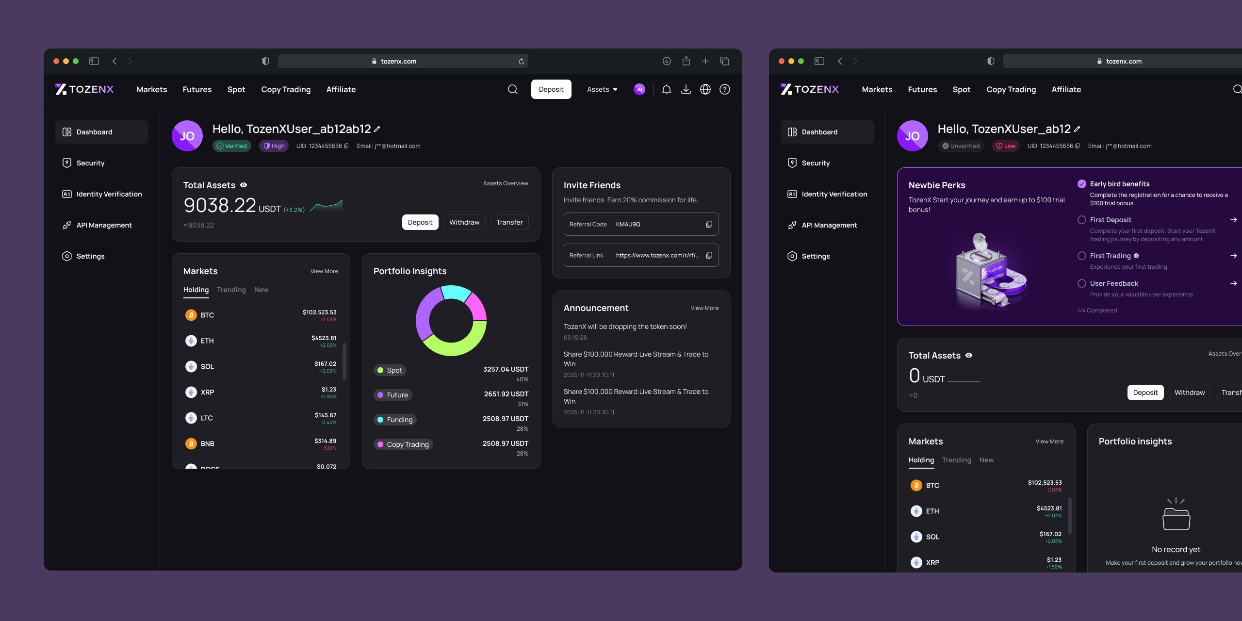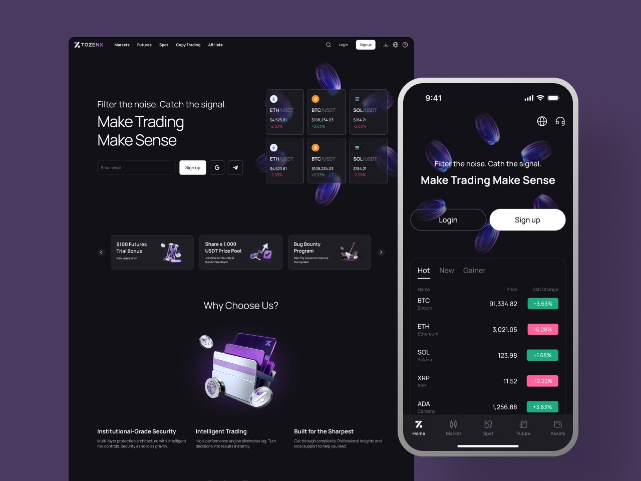 At TozenX, I led product design for a new cryptocurrency exchange built from the ground up. Beyond designing key surfaces like onboarding, account management, my role was to ensure the entire platform behaved as a coherent product — not a collection of features.